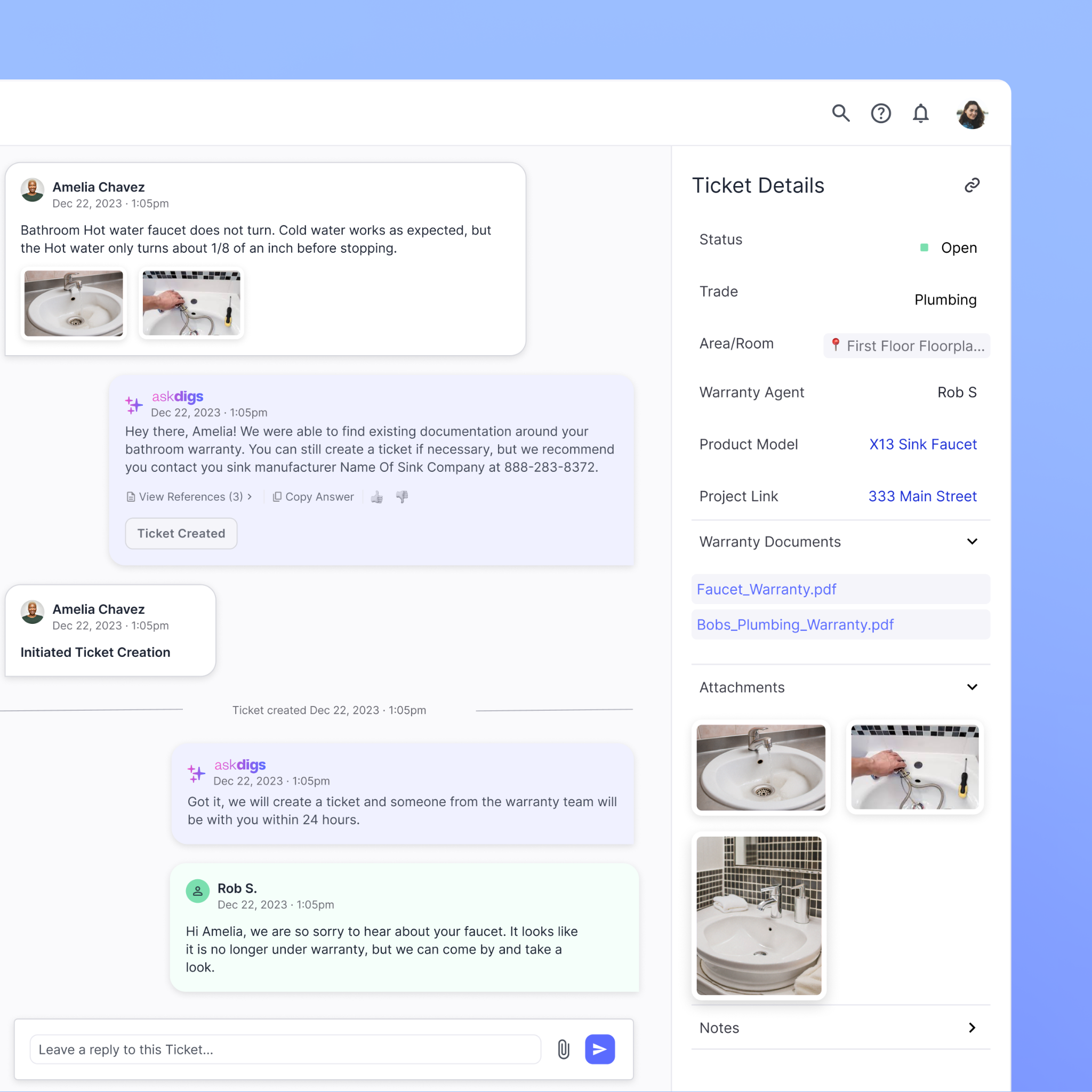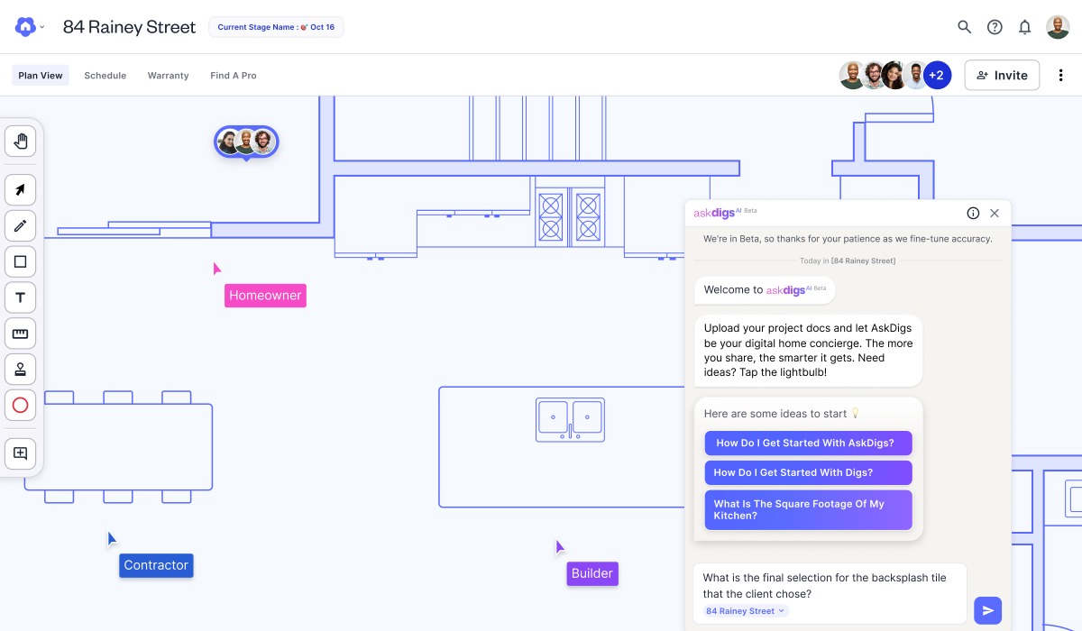 Digs is an AI-powered collaboration software built for homebuilders. From pre-con to aftercare, it keeps your team, trades, and clients aligned with one centralized workspace for decisions, documentation, digital handoff, and ongoing warranty support.